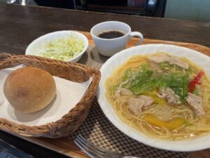 ガラスープで煮込んだ豚肉や野菜をトロリとした餡に仕上げてパスタと併せました。